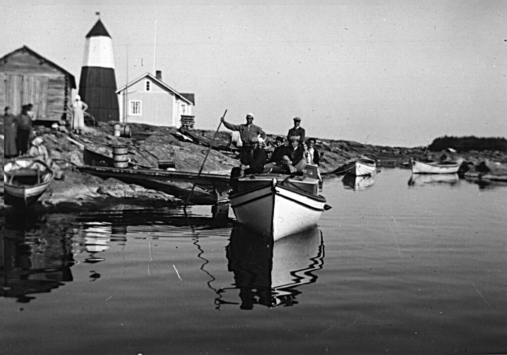 To catch herring, nets are placed in a curved manner in the water. The nets are then lifted and fish shaken out. Since the nets were made of cotton until the 1950s, they were then put up to dry on special racks. Previously, the fishermen from Soklot rowed or sailed to Soklothällan, to then stay the night in either the ”Hovrätten” cabin or the oldest cabin. After 1910 motorboats became more common, and thus the cabins were no longer necessary. In the photograph is the Wikström family, residents of the isle, together with a guest. To the left is the boat belonging to pilot Herman Sämskar. The photograph is taken mid-1930.