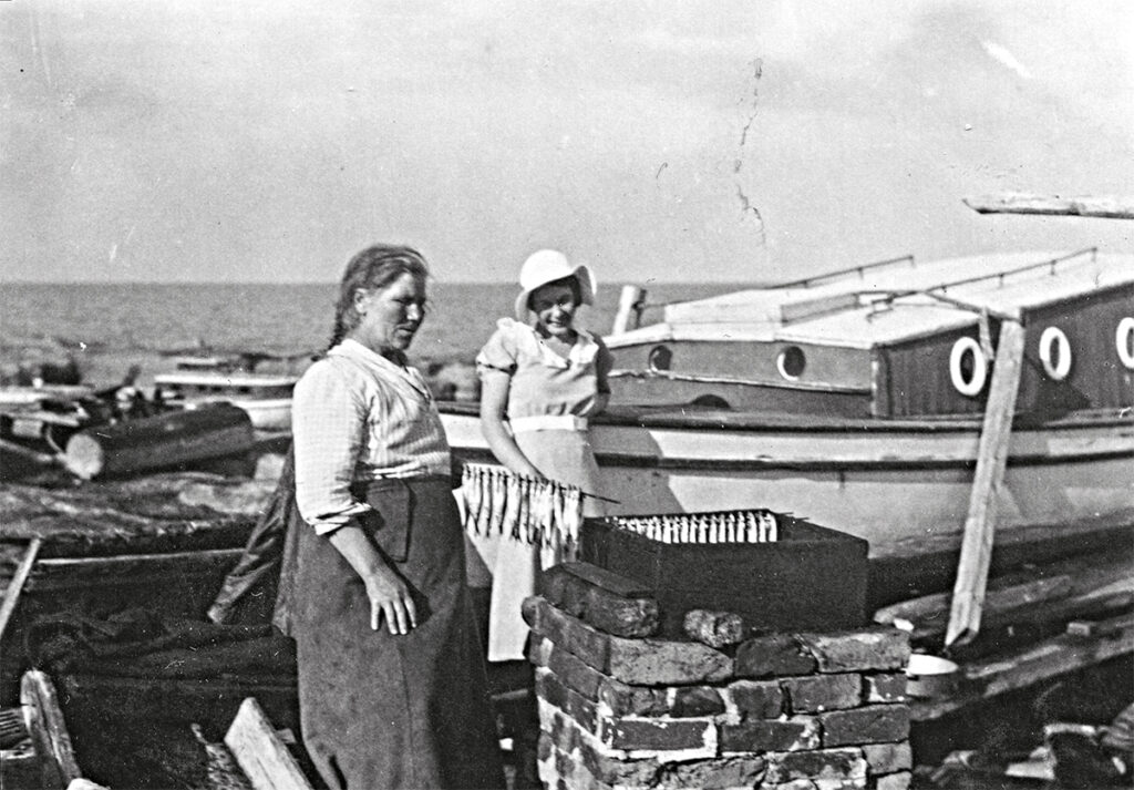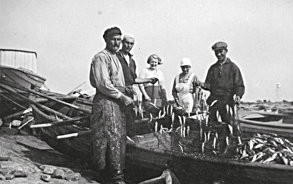 In an oven by the harbour, buckling would be smoked. After being smoked, the buckling was packaged in wooden boxes with graseproof paper inbetween layers, and salt added. The buckling was sold on the markets of Jakobstad and Nykarleby until the mid 1940s. Amanda Wikström, wife of pilot Johannes Wikström, was in charge of the smoker oven. The boat on the right-hand side is the first motorboat Johannes Wikström owned. All that is left of it today is the fairlead and a cleat, both of which are in use on another boat today. The photograph is from 1935.