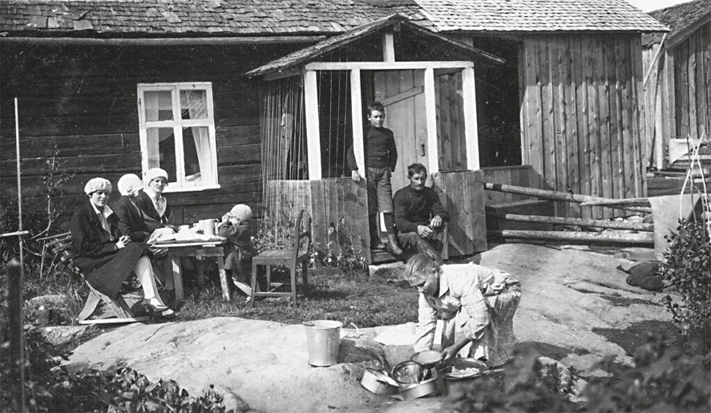 A vast portion of the kitchen duties were taken care of outdoors. In the image is Amanda, John, Johannes Wikström, and some guests. Soklothällan was a popular excursion destination. Notable people that have visited Soklothällan are i.a. poet Mikael Lybeck and his wife Louise, and composer Erik Bergman with his wife Sylvelin Långholm. The photograph is presumably captured in the summer of 1927.