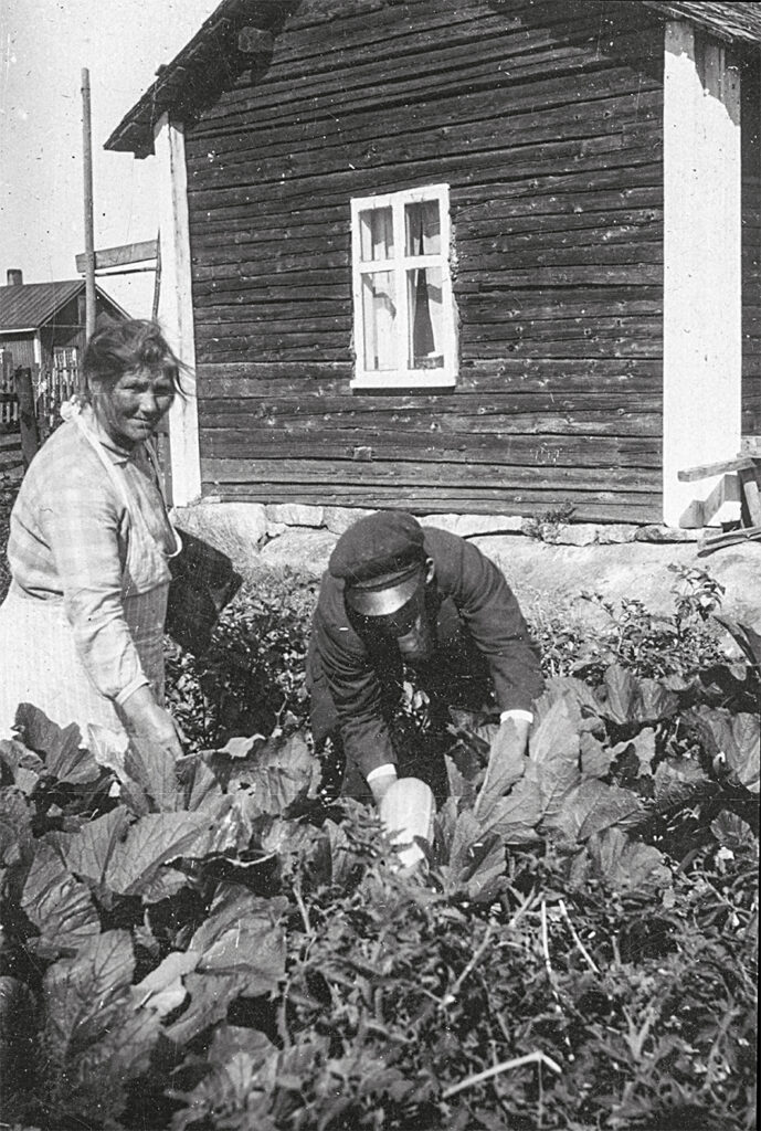 Amanda Wikström set up a garden of flowers and useful plants in front of the family cottage. The stone wall around the garden is still intact. The gradens were caged to prevent sheep from eating the harvest. The photographs are from the mid-1920s.