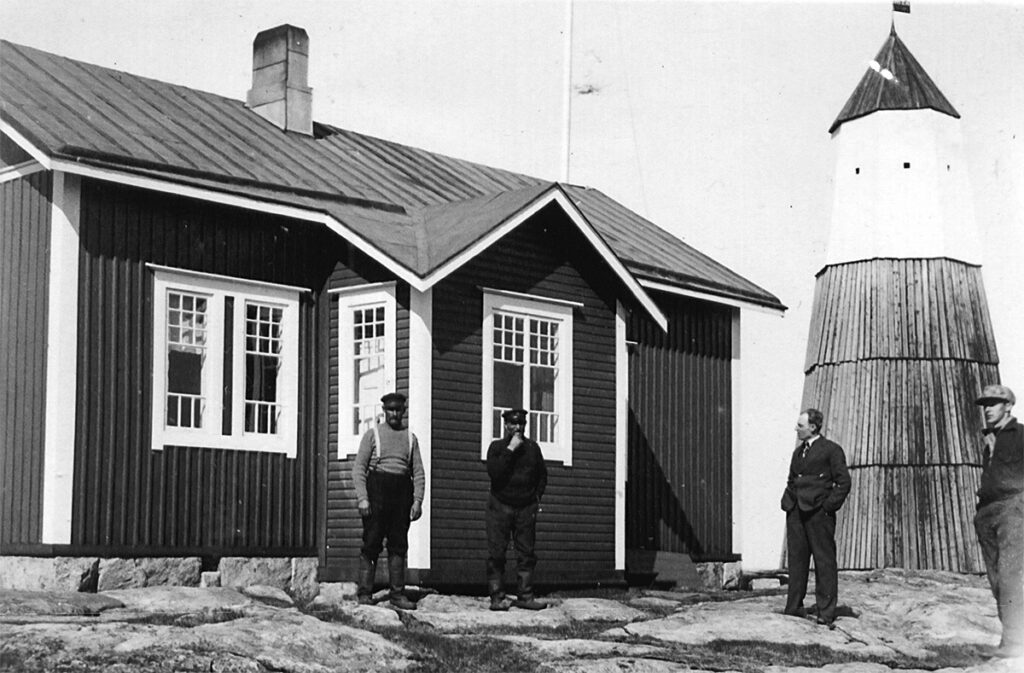 As the pilotage was russified in 1912, the first pilots in the new station were russians, instated in 1913. In the summer of 1918 the local pilots were reinstated. The station was painted yellow in 1937. In front of the cabin are pilots Johannes Wikström and Herman Sämskär. The photograph is captured ca. 1935.