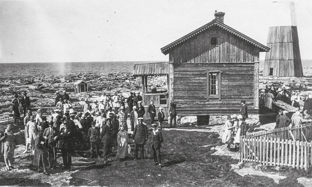 In 1924 the daymark was 100 years old and a jubilee celebration was held. The 15th of August 1924 a notice about the jubilee was published in the Österbottniska Posten newspaper. During the 1920s the church arranged celebrations and excursions on the isle. The photograph depicts a summer party, and is likely from the same era as the 100-year jubilee of the daymark.