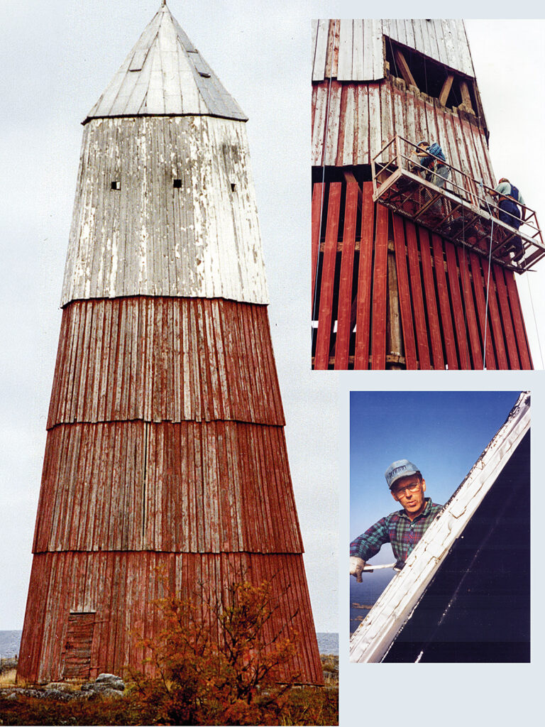 During the late 20th century the daymark started to decay. In the summer of 2000 new boards were installed and painted in the original colours: A black ”cap”, white ”blouse”, and red ”skirt”.